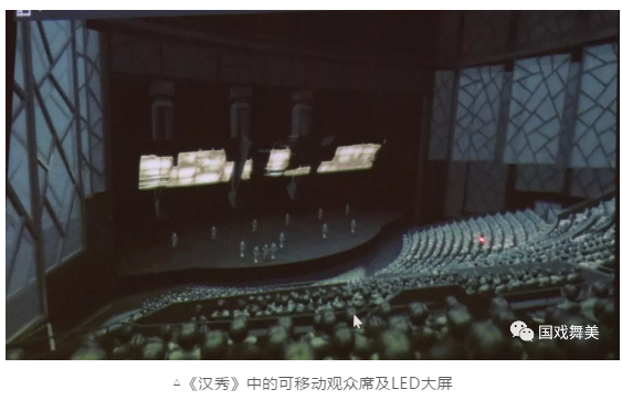 萬(wàn)達(dá)集團(tuán)制作的《漢秀》,由三塊液壓傳動(dòng)控制的、可俯仰、旋轉(zhuǎn)的LED大屏配合可旋轉(zhuǎn)、升降觀眾席形成兩種不同觀演模式:一種是觀眾全正面面向舞臺(tái),另一種是正面與側(cè)面的結(jié)合。