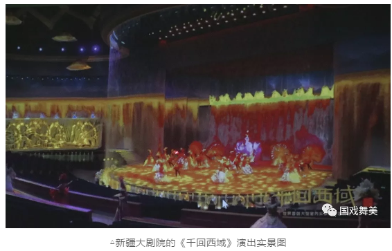 在新疆大劇院的《千回西域》中,大量空中威亞的運(yùn)用,使演員可以到達(dá)表演區(qū)的任何地方;升降臺(tái)與水臺(tái)的使用,將真實(shí)的水效場(chǎng)景搬到劇場(chǎng)里面;為馬奔跑而研制的跑馬機(jī),能將馬奔跑的絕對(duì)距離和相對(duì)速度限定在某一相對(duì)空間中;可以變化出不同圖案及文字的水幕造型機(jī),則是一種既浪漫又富有功能性的舞臺(tái)機(jī)械裝置。