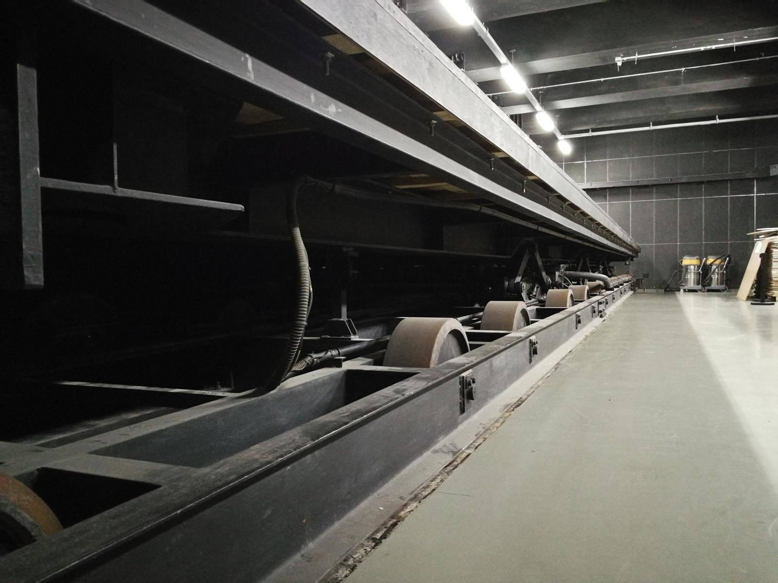 芭蕾舞車臺由安裝在鋼架的支撐輪和2個齒輪架上(齒條驅(qū)動時)的鋼結(jié)構(gòu)桁架組成。外部驅(qū)動裝置隱藏在芭蕾舞車臺臺體和主升降臺臺面之下。與臺車下部的齒條嚙合,向臺車傳送動力。由設(shè)置在第三、四塊主升降臺上的驅(qū)動裝置通過接力技術(shù)完成整個行程驅(qū)動。或可由電動摩擦輪提供行走動力。