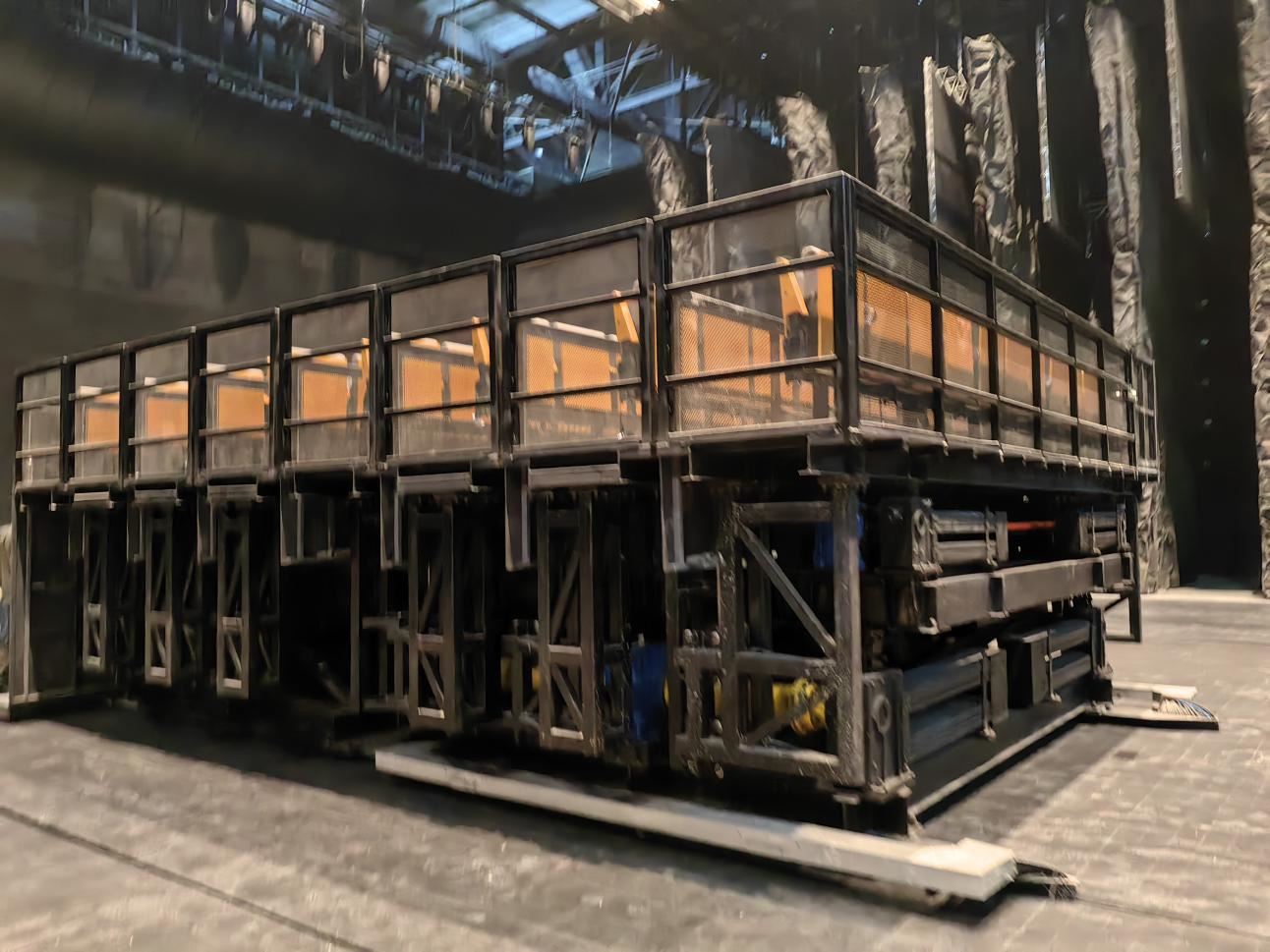 沉浸運(yùn)動式觀賞座椅臺為“淺基坑大行程”類型設(shè)備,采用多級升降機(jī)構(gòu),可升降和行走。升降單元共分8個(gè)子單元臺階,
